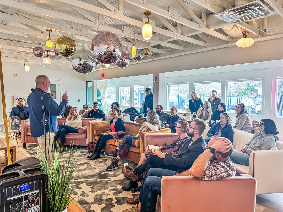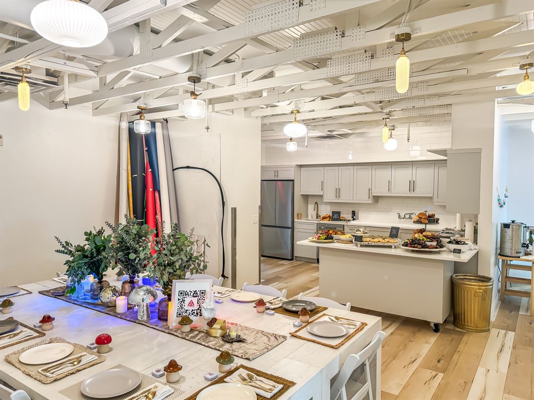 Beautiful light & bright art gallery and photo studio with homestyle serving kitchen, large gathering space with velvet couches and plenty of room for photography, small gatherings and workshops or intimate parties.