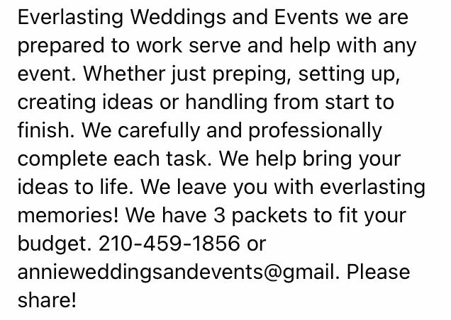 Everlasting weddings and events - We are prepared to work, serve and help with all types of Events. Whether just prepping, creating ideas, setting up, or handling from start to finish. We help bring your ideass to life. We carefully and professionally complete each task. We leave you with Everlasting memories!