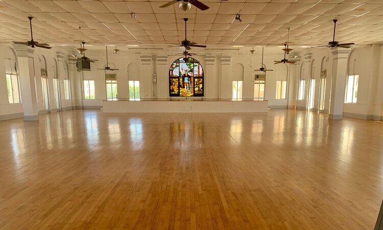 The historic Hermann Sons Home Association building houses a ballroom on the top floor that is perfect for special occasions. Located downtown San Antonio, we have free parking for events. The ballroom features original hardwood flooring and beautiful Stained Glass art created in 1911 by Helen Ferne Goolsby Slimp. The event space has a bar and your fee will include a bartender. We also supply the security, tables, and chairs, and clean up after the party. You provide your own licensed catering service, music, and decorations.