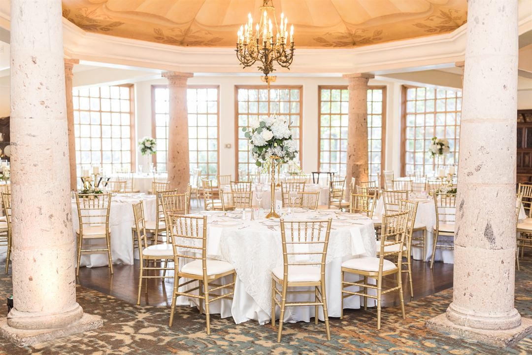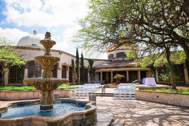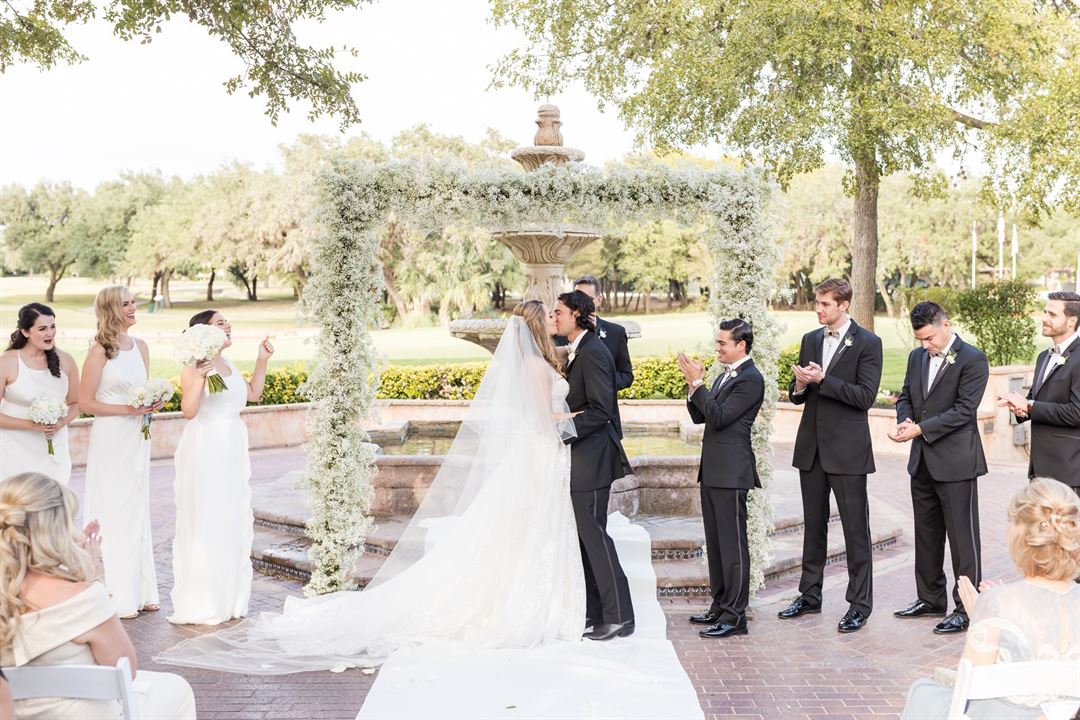 The Dominion Country Club provides an elegant setting throughout all the seasons. The outdoor venue offers majestic live oaks and hills of green, accented by a beautiful lake and a flowing fountain that sets the tone for a tranquil outdoor ceremony. Wedding guests sit on three levels of white-cushioned seats to ensure unobstructed views of the ceremony near a blooming flower bed alongside the Cantera-stone fountain. The sitting room features expansive floor-to-ceiling windows and Cantera-stone columns that encircle the dance floor beneath an octagonal dome. The Renaissance-style architecture carries over to the more-intimate wine room, where a magnificent chandelier hangs within a domed ceiling with a painted backdrop of sky inspired by Michelangelo's work. An expansive 2000-square-foot dance floor and a hand-carved bar and atrium is available for larger weddings. We’ll customize a package that exceeds your expectations, fits within your budget, and creates lasting memories for you and your guests.