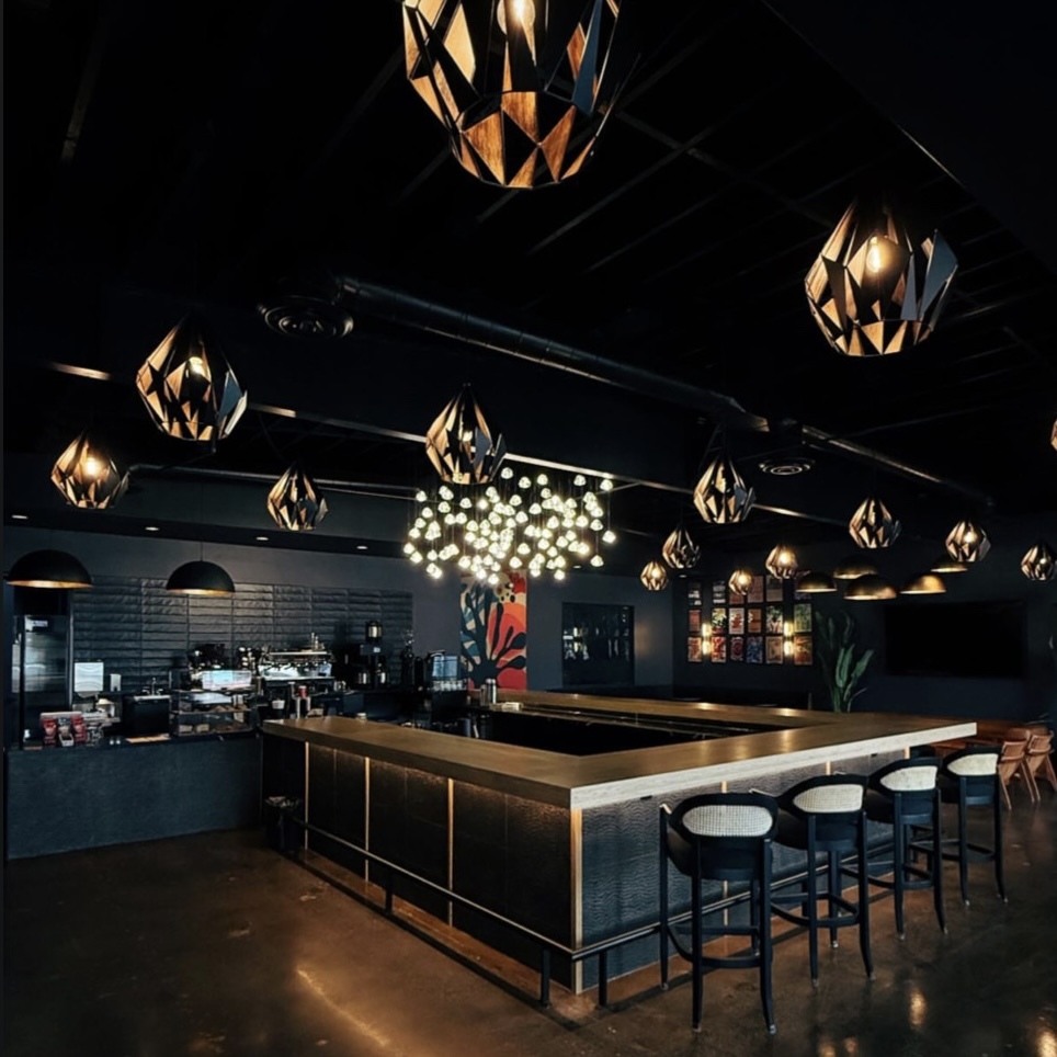 * The space is anchored by a center bar, custom-built for service flow and audience engagement. It opens up into multiple functional zones: