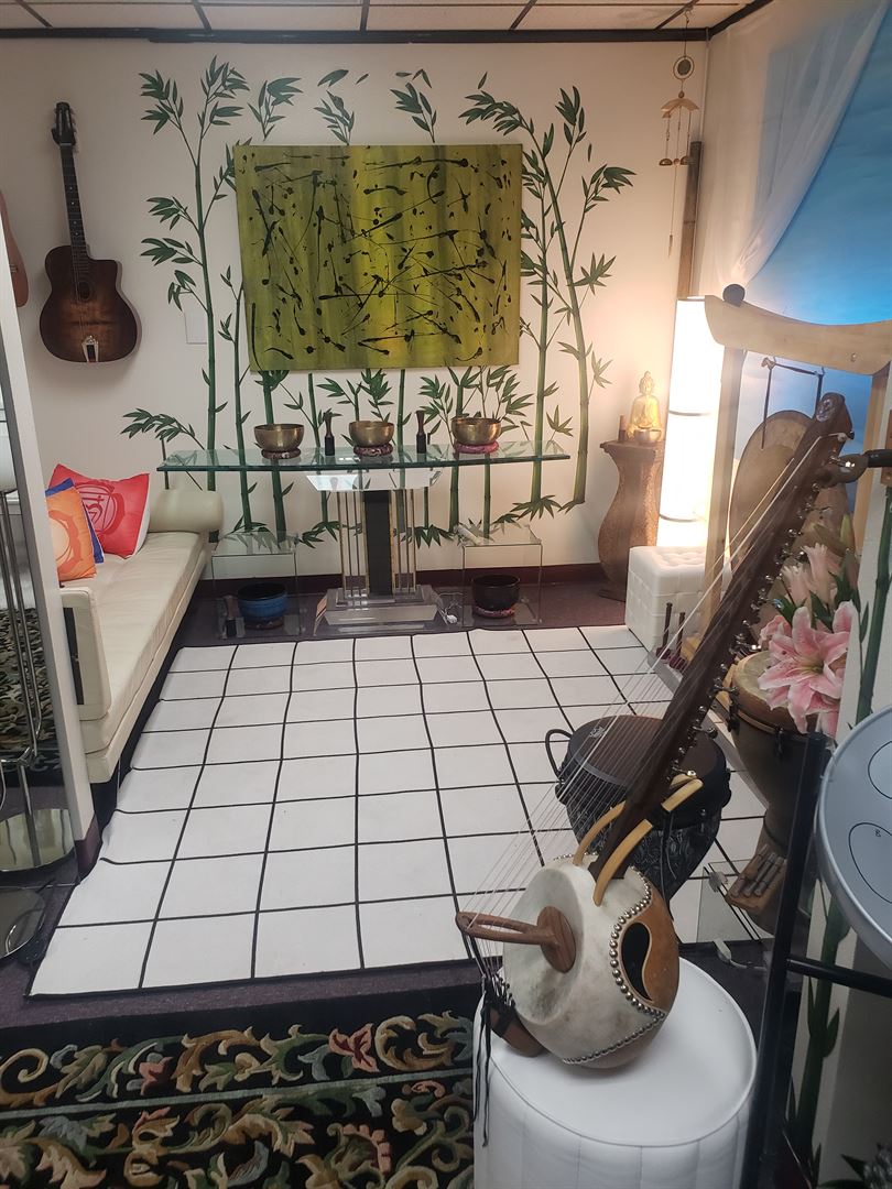 The main room is connected to a 15' x 30' sound healing room with a secluded area for massage (the massage table can be removed if the space is needed for other purposes). This area has a couch, singing bowls, drums, a gong and other musical instruments.