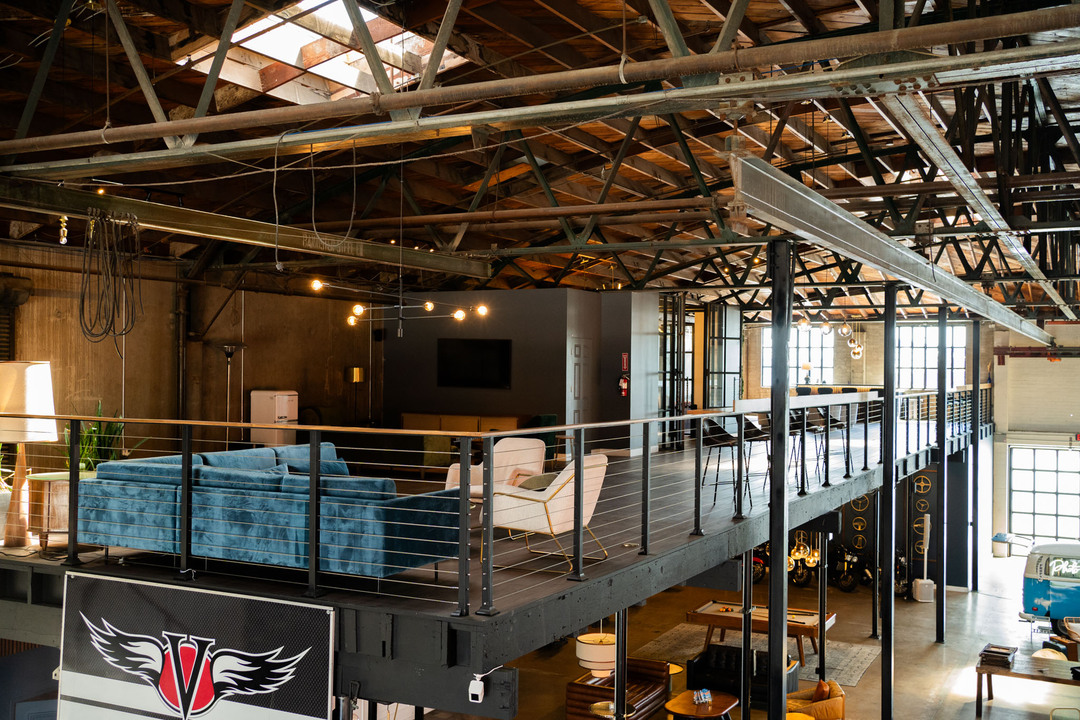 - Industrial-chic design with unique automotive decor for a bold, upscale vibe