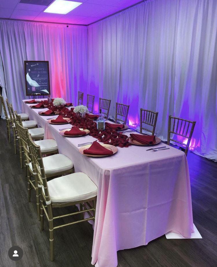 What makes us different from other venues is that our space is already beautifully draped and we include standard tables, chairs, and many decorations (throne chair, boxwood hedge backdrops, flower walls, etc.) for free!