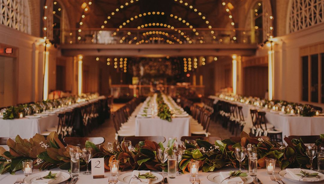 The Grand Hall features a soaring ceiling and skylights illuminating 6,500 square feet of historic mosaic tile.