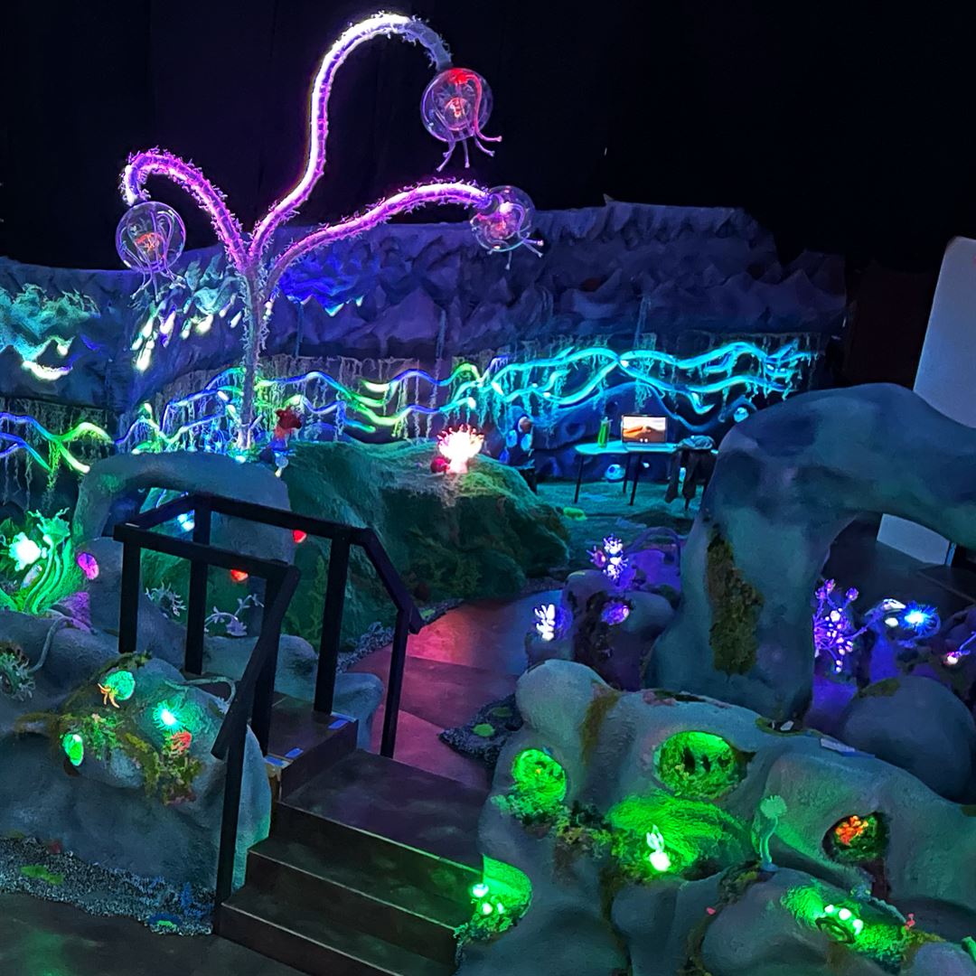 By day, the interactive playground invites attendees of all ages on a self-guided expedition of cosmic discovery. At night, the environment transforms into a premier event space available for private rental, complete with dance floor, DJ booth, and enveloping music visualization, with each extraterrestrial flora in the forest responding to music and motion in its own unique way.