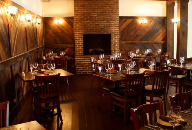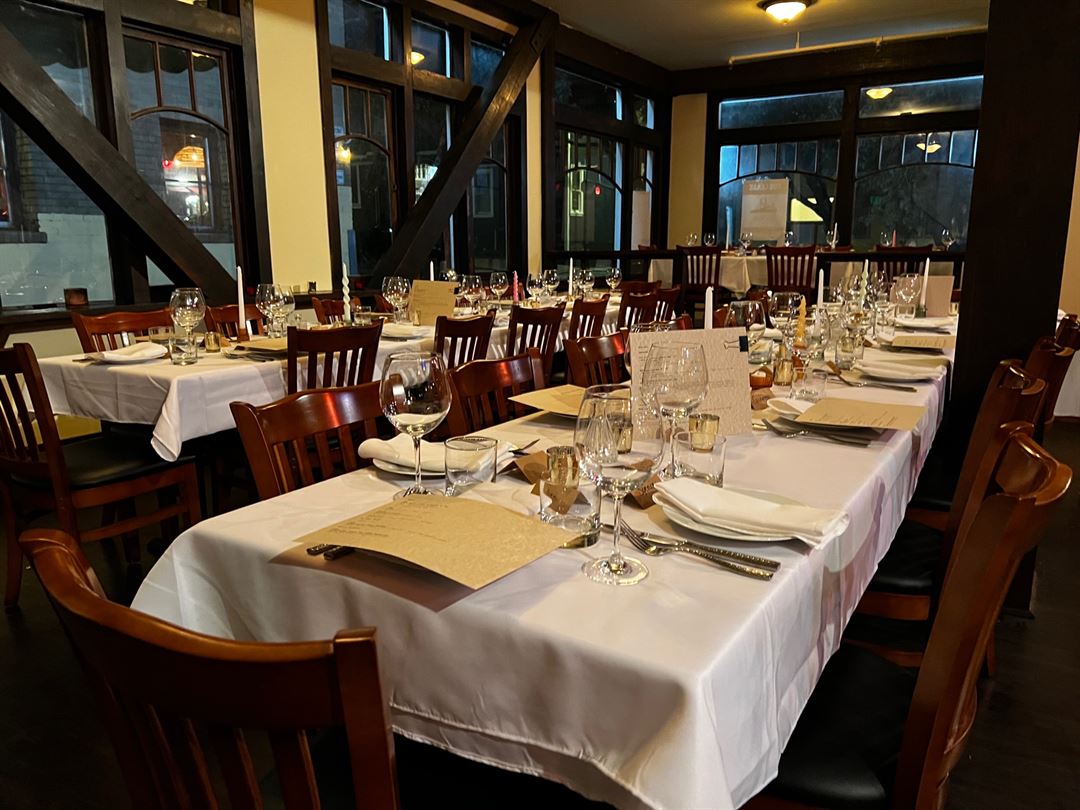 Featuring two large dining rooms, one private with dark mixed wood West Coast craft wall panels, stained glass, brick, and seating for 70 with room for more.