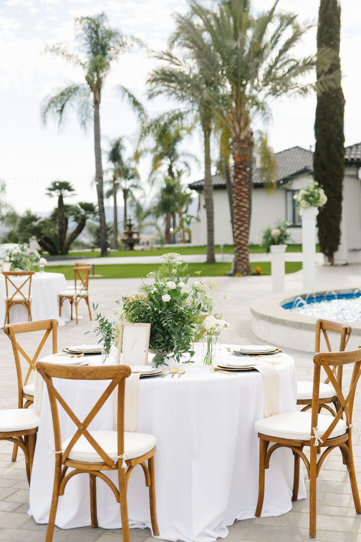 - Reception includes tables, chairs, a fountain, palm trees, and string lights.