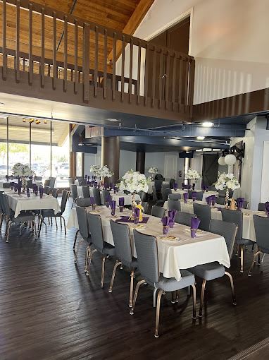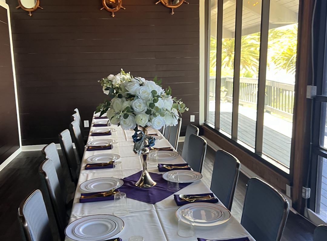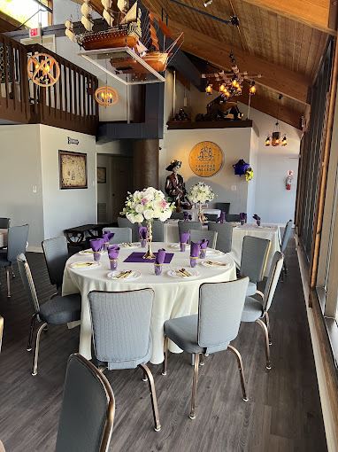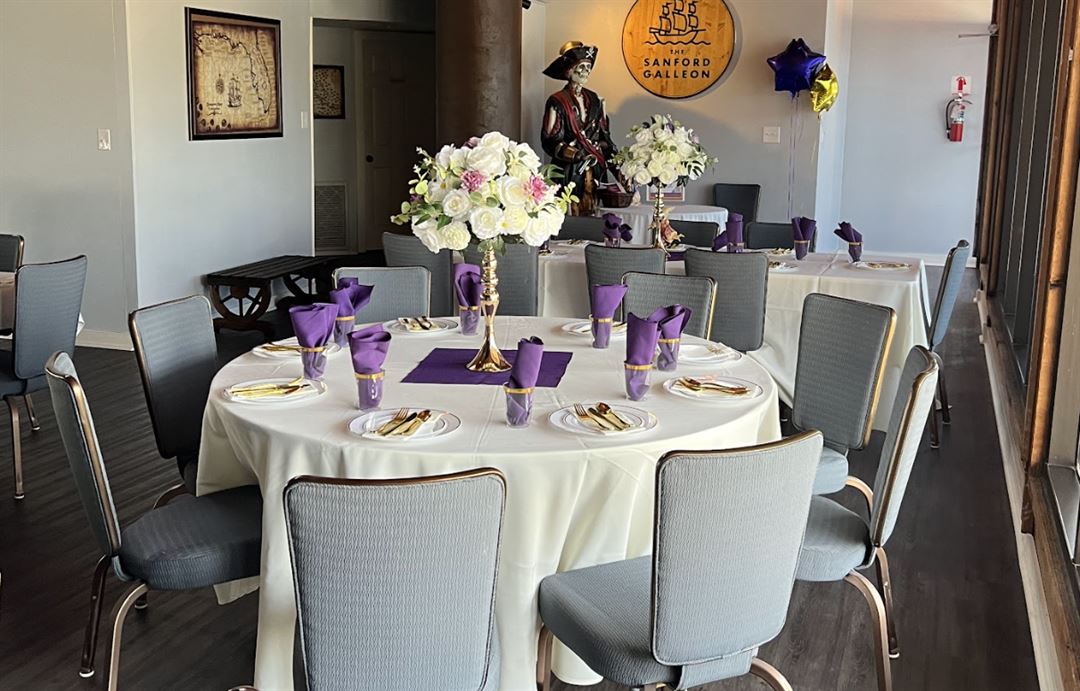 The Sanford Galleon is a 4,000 square foot event venue overlooking Lake Monroe, featuring a 70-foot wall of floor-to-ceiling windows for stunning water views from a climate-controlled space. It boasts unique architectural elements like circular zones, a tongue-and-groove cedar wood ceiling, and wooden beam chandeliers, all within a nautical theme with pirates, mermaids, and galleon ships in shades of blue, grey, and brown. The venue includes a full bar, changing room, and a separate conference room. Completely remodeled in 2024, it offers a beautifully themed décor.