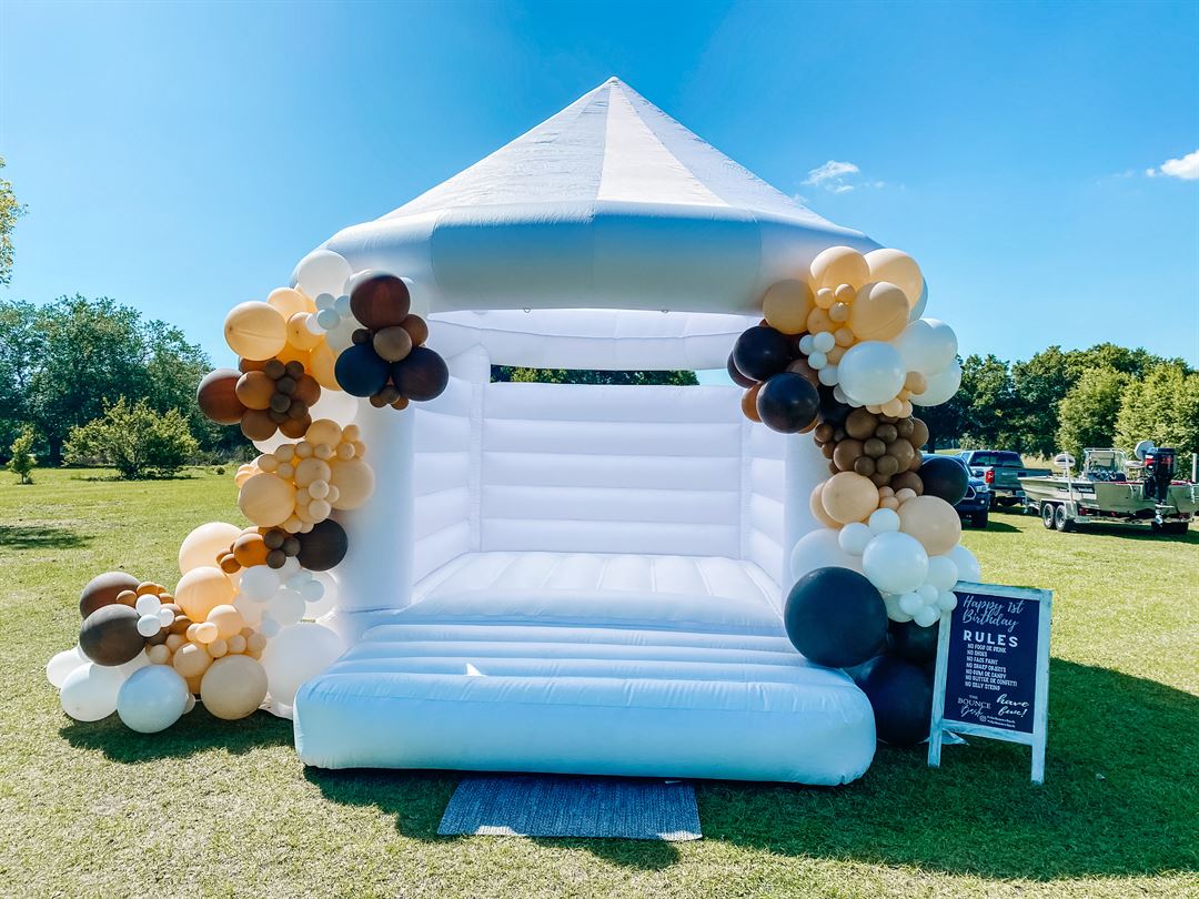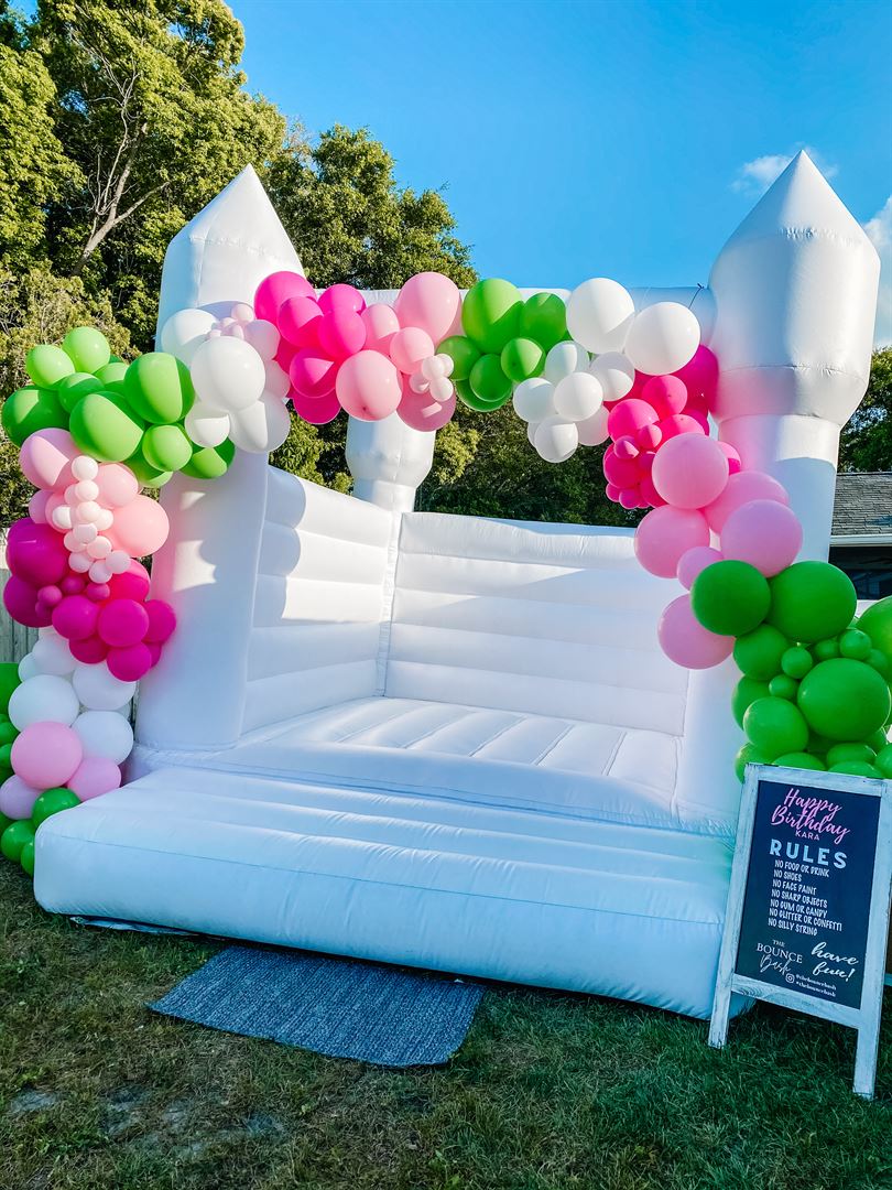 We provide all white bounce houses, backdrops for photos, organic balloon garlands, and marquee letters. Our gorgeous, white inflatable bounce houses + balloon garlands to make your or your client's special event memorable.