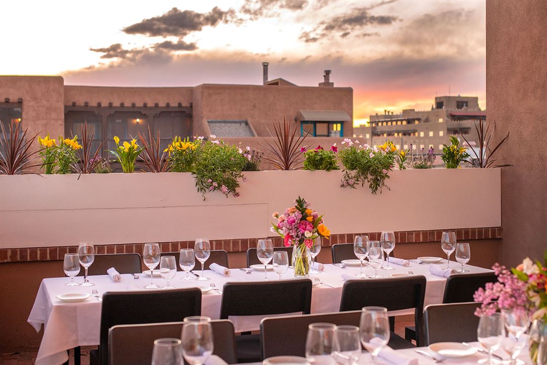 Located in the heart of downtown Santa Fe, the Sunset Terrace showcases historical Santa Fe architecture and one of the best sunset views the city has to offer—not to mention the backdrop of the Sangre de Cristo Mountains.