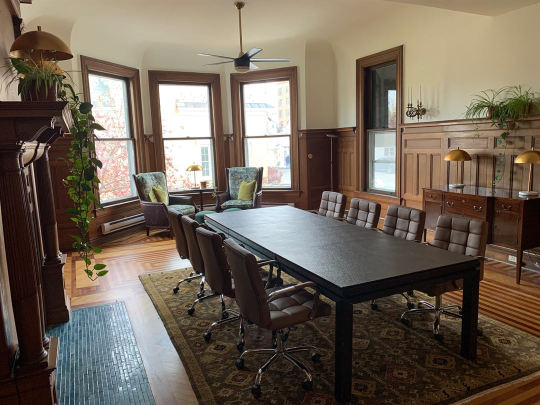 Rent luxury event space for your next intimate get together, conference, or professional meeting in downtown Saratoga Springs, New York. This intimate venue is perfect for cocktail or dinner parties. Our 40-person venue offers a wide, open space with high ceilings, gorgeous parquet floors, and modern décor ready for you and your guests. While we do not provide food or drink, our spacious kitchenette makes it easy to bring and store your own goodies, or have them delivered!