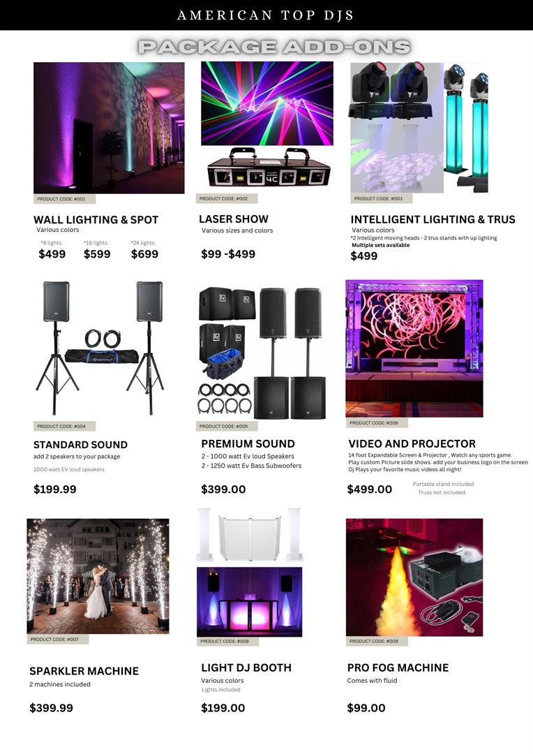 Playing for but not limited to: High End Events, weddings, Clubs, Sweet 16, Anniversary parties, Corporate Events, Family reunions, Graduation parties, Kids Birthdays etc. We have top of the line sound and lighting equipment.