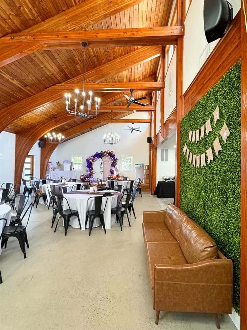 Impressive, newly renovated indoor and outdoor venue space to host your next party or gathering! Rustic, modern, and chic. Year round. Half Day or Full Day options. Perfect for Bridal Showers | Baby Showers | Graduation | Birthdays & Sweet 16s | Holiday Parties | Corporate Events | Intimate Weddings