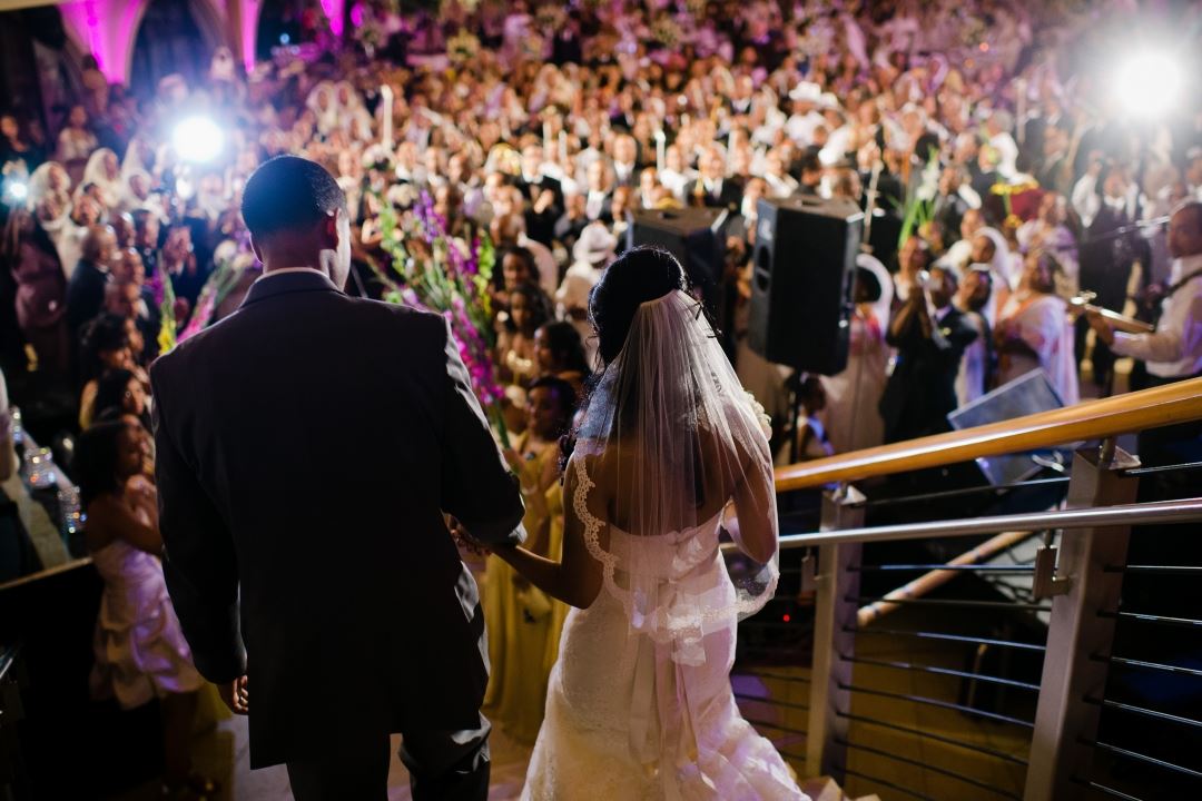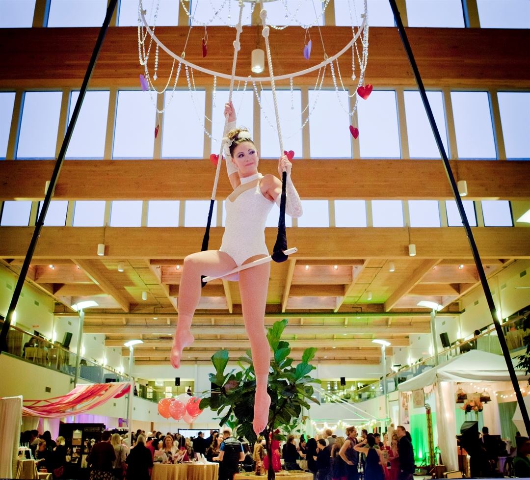 This elegant space is the picture-perfect place for weddings. The beautiful staircases give every bride and groom the grand entrance and descent to the altar that will make fairytales seem real. With clerestory windows natural light pours into the space and at night you get a glimpse of the stars in the night sky.