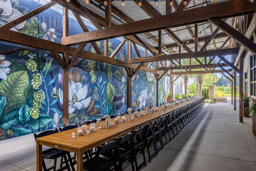 What sets The Grove apart is its exquisite interior design, marrying Southern elegance with modern flair. The grand indoor event center features high-beam ceilings adorned with chandeliers, creating an atmosphere of sophistication. Guests will be captivated by the striking custom-built bar, as well as the custom-painted mural, by renowned muralist Gillian Fazio, which adds a unique touch of beauty to the beer garden and outdoor patio area.