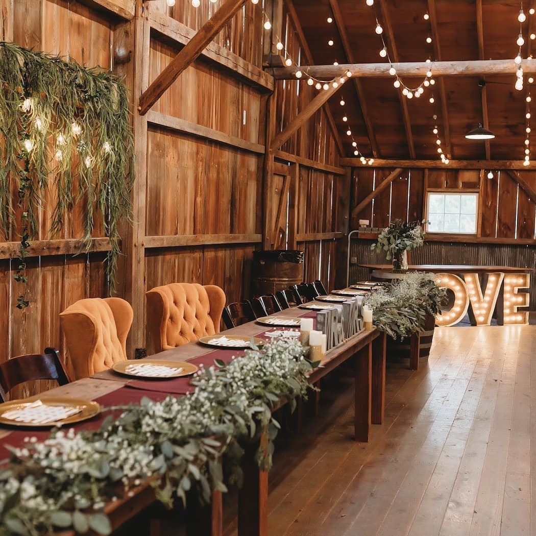 Nestled amid the trees and adjacent pond, the grounds surrounding the barn provide not only picturesque and shady settings for your guests to mingle, but ample opportunities to place your hand-crafted decorations. Chandeliers hanging from overhead timbers, wooden floors, a giant sliding barn door to reveal the bride, long harvest style tables, and sunlight pouring through gaps in the weathered wood siding are all features you can expect to help you create a truly picturesque "barn wedding" experience.