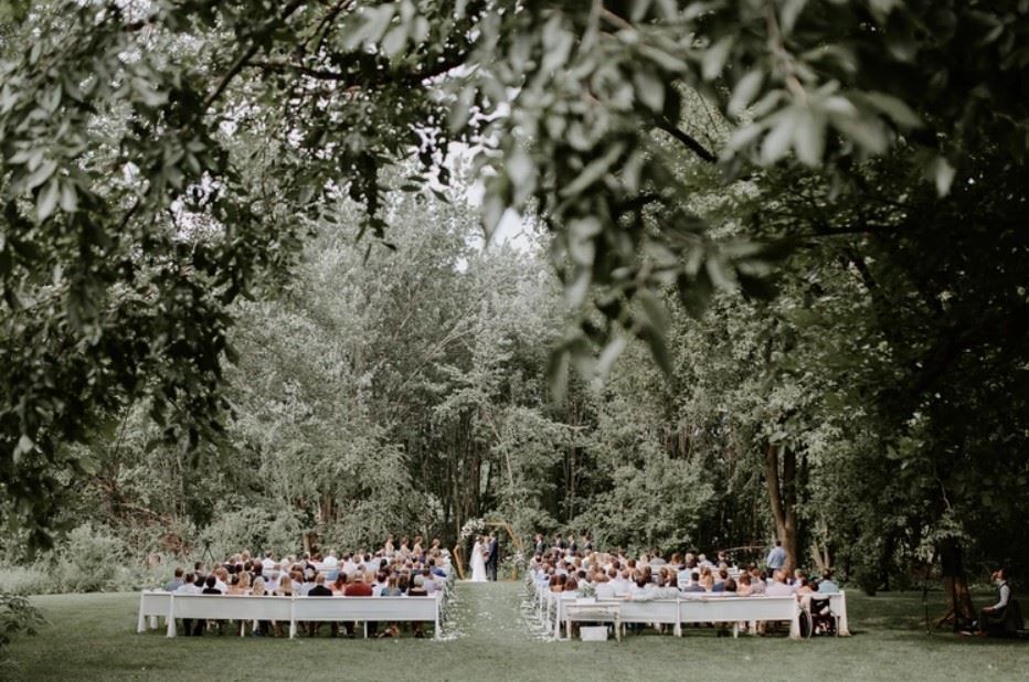 The property is unlike any other in that there are mature trees, grassy plains, lush fields, Bloom's Lake, and vine covered stone walls from the remains of a historic granary. Antique church pews in a wooded clearing make for an unforgettable outdoor ceremony location.