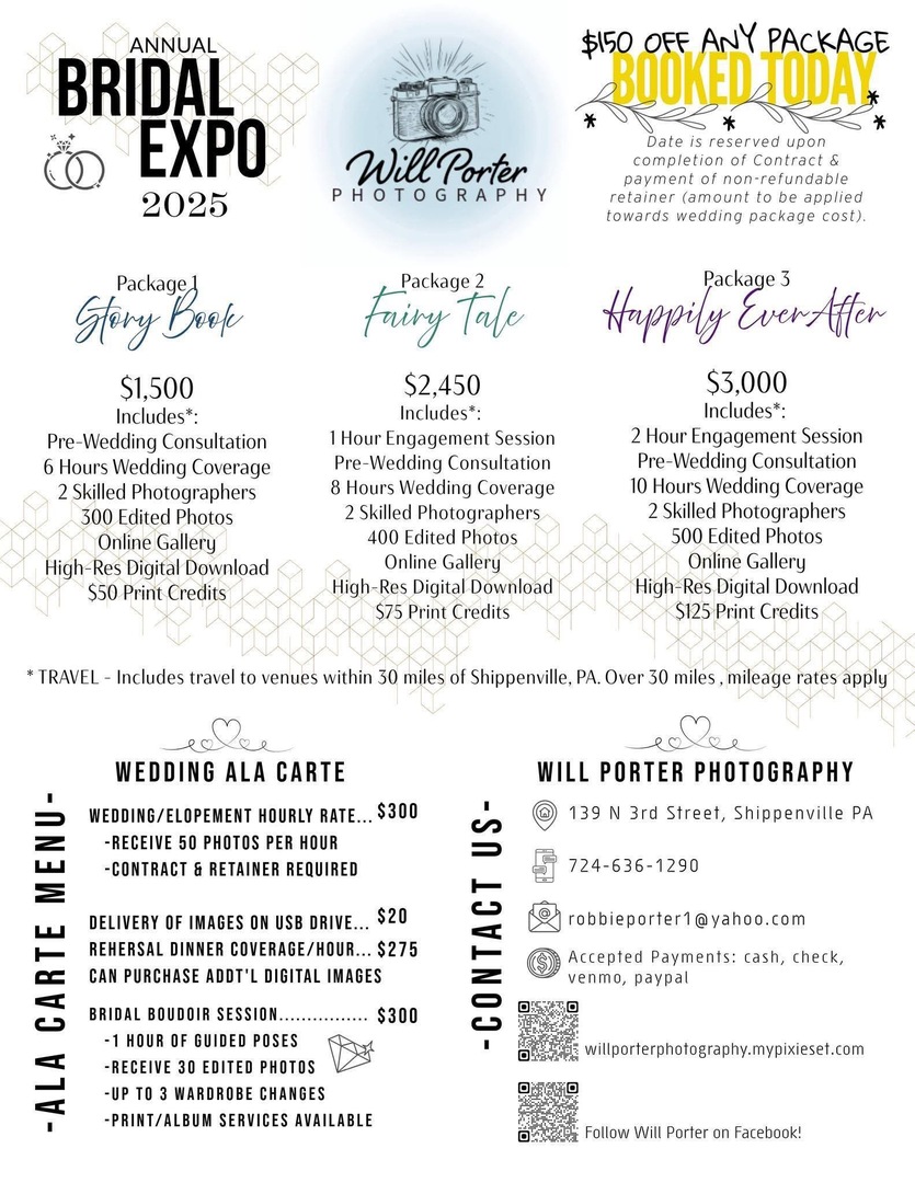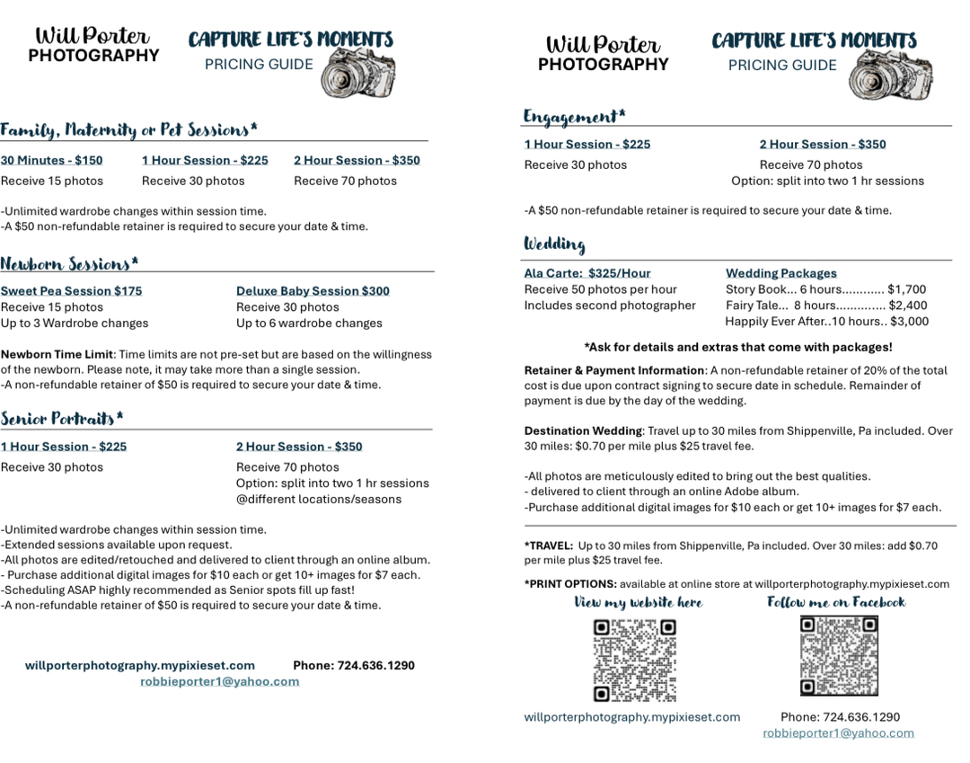 At Will Porter Photography you get two highly skilled photographers for the price of one! We cover almost all of Western Pennsylvania as well as destination weddings! Capturing memories you can cherish for eternity is our ultimate goal and we strive to deliver that with every single client.