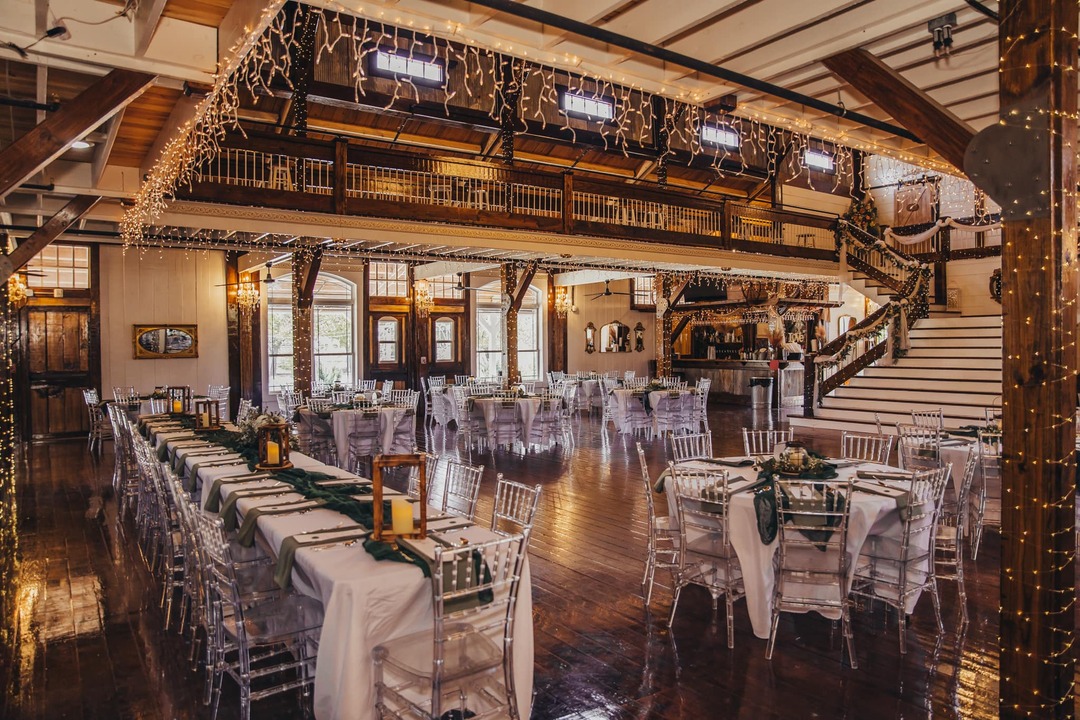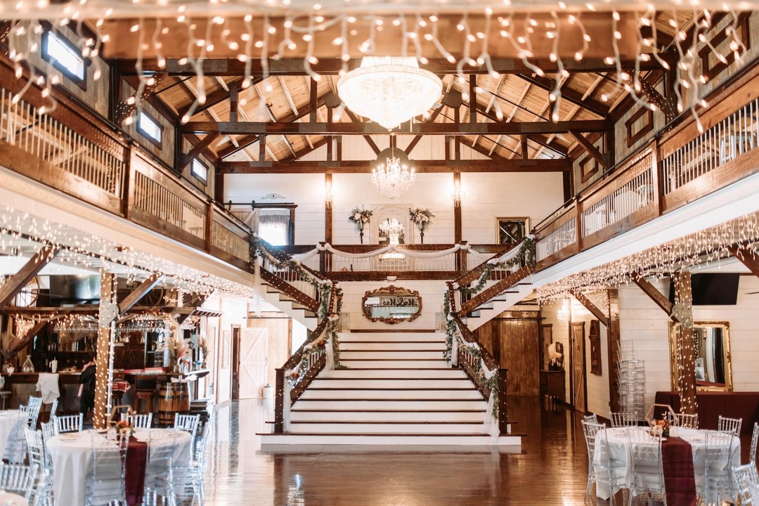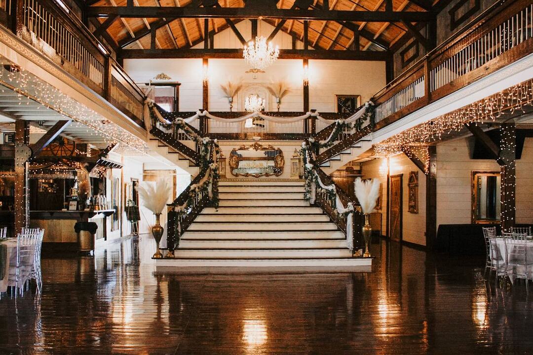 Enchanted Valley Venue is a fairytale setting whose barn invites couples to host the big day of their dreams. This bright red and white building shines out amidst the deep green of its surrounding fields. Inside the wedding party will find an authentically rustic space surrounded by wedding cake white walls, trimmed with stained english chestnut beam work and wooden floors. The open dance floor is framed by rugged wooden balconies and a beautiful grand staircase. Guests can raise the roof of Alternatively, the property’s grounds are an amazing location for an outdoor ceremony under the tall branches of a wise this roomy setting for a night of celebrations under its chandeliers, which add a touch of glamor to the space. old tree, which can be decorated in string lighting. There is even a Cinderella-themed get-ready suite where guests can prepare for the big day, with or without the help of a Fairy Godmother, and you even get your very own white carriage!