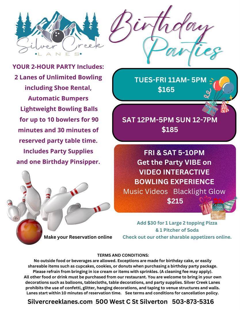 You can find Silver Creek Lanes in the beautiful city of Silverton Oregon right on the Creek. With a great menu and atmosphere, we offer more than just bowling.