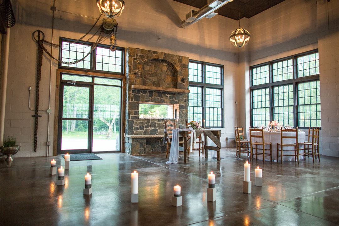 Open fireplace connecting the venue and outside patio which is on the beautiful Skaneateles creek