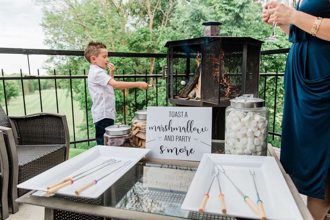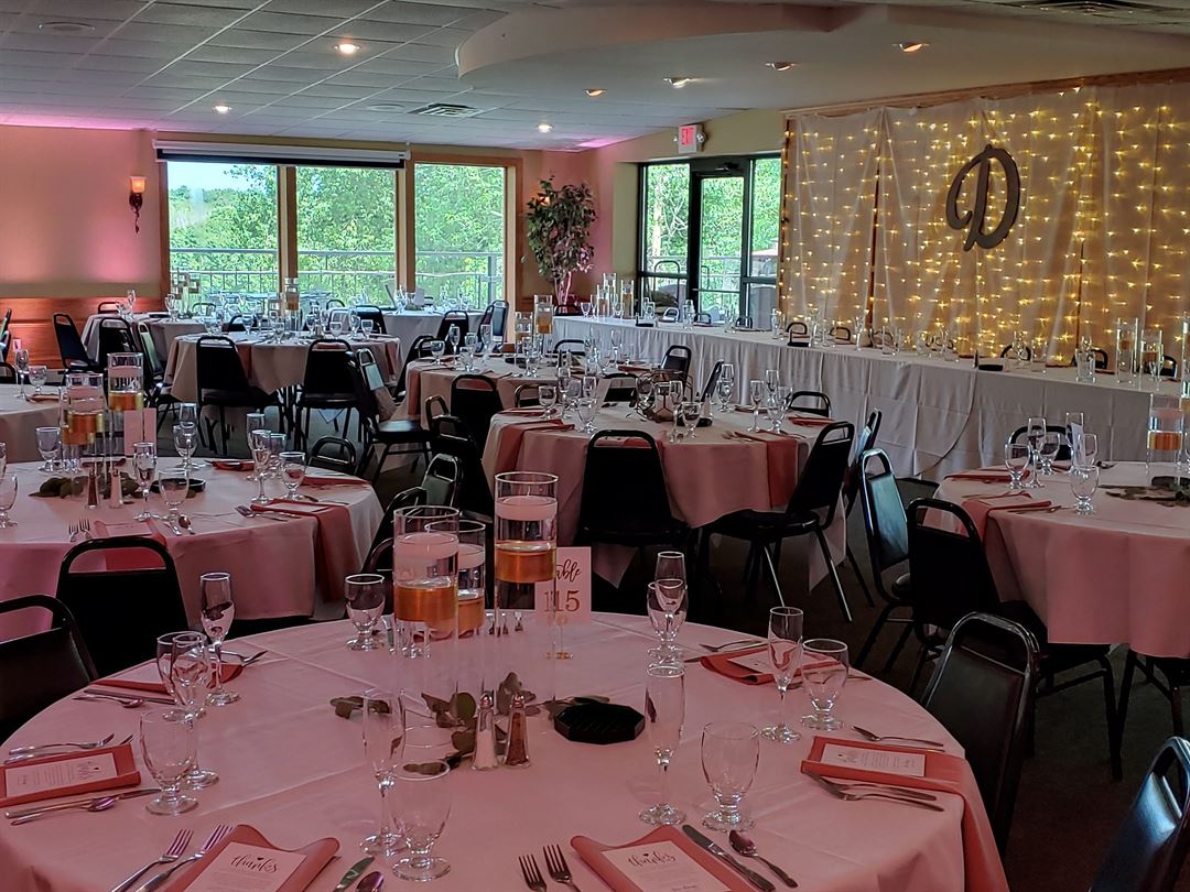 The private space accommodates up to 220 people. The room features a large full-service bar, stone fireplace, panoramic views of the golf course, a spacious dance floor, a large covered patio with inviting lounge furniture and fire-pit, and a second deck off the bar. Host your ceremony on our 1st or 10th tee box and let the golf course create a beautiful backdrop!