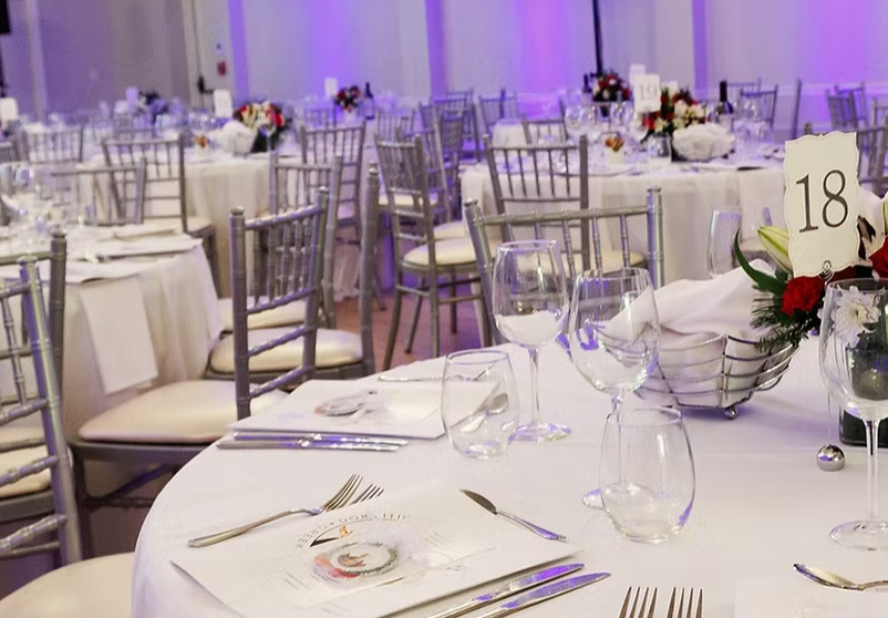Seating for Up to 250 Guests: Featuring elegant Chivari silver chairs and round tables, perfect for any gathering size or style.