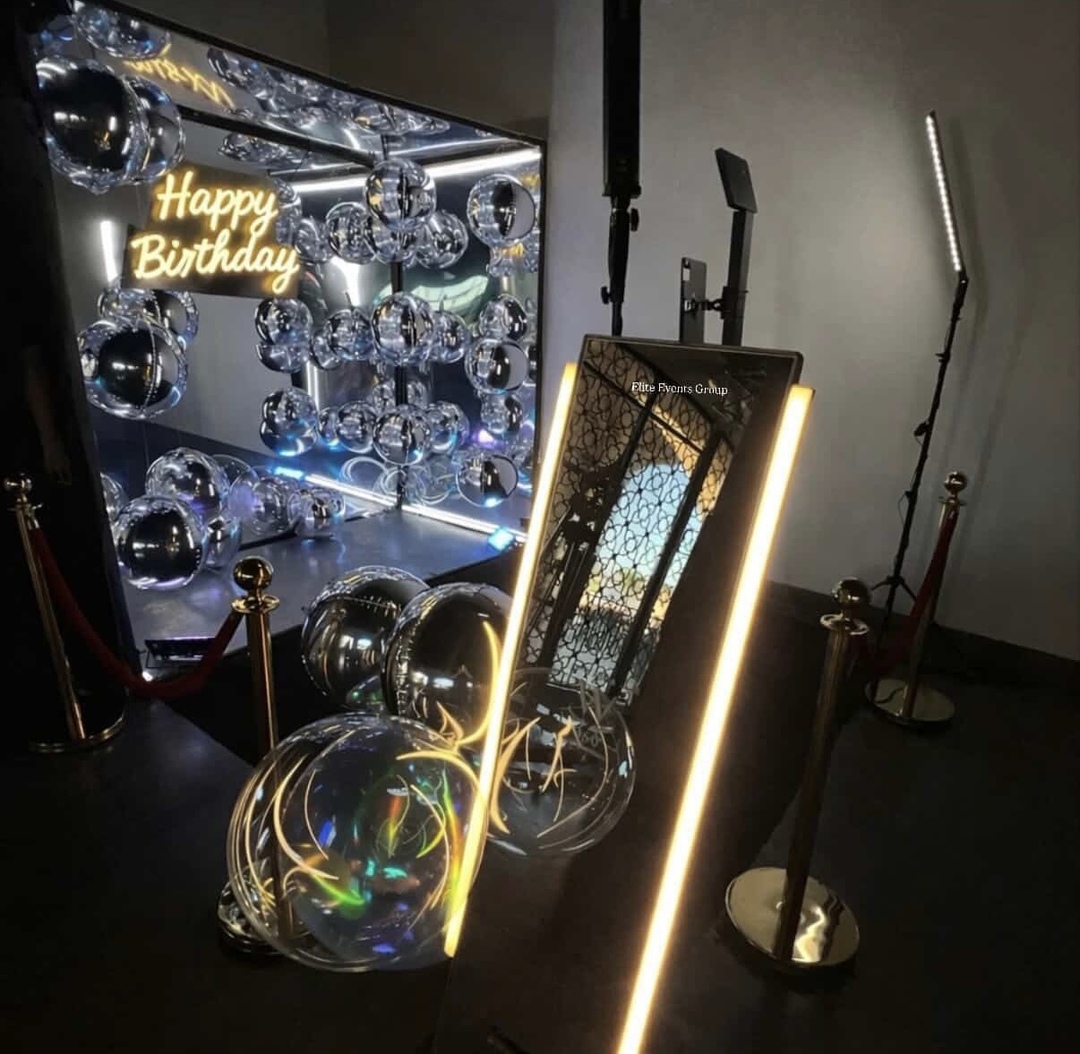 We specialize in creating immersive event experiences through custom balloon decor, floral installations, stylish backdrops, and our signature photo booths including the Mirror Photo Booth and Vogue Magazine Booth, both featuring custom LED lighting
