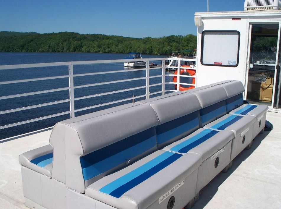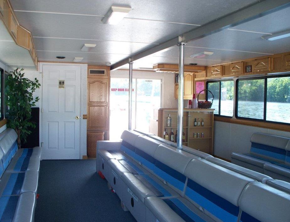 The Lady Bea can accommodate up to 49 passengers. There is no minimum number of passengers, as you are renting the boat for the time specified, not per passenger. The lower deck is enclosed with AC, a restroom, satellite radio (Sirius xm) and a bar (accepts cash and credit cards). We ask that no outside food or beverages may be brought on board. The upper deck is all open. When you book a private charter, the boat is dedicated only to your group for the time that you choose. The boat is comfortable with booth seats, however there are no tables for eating dinner on board.