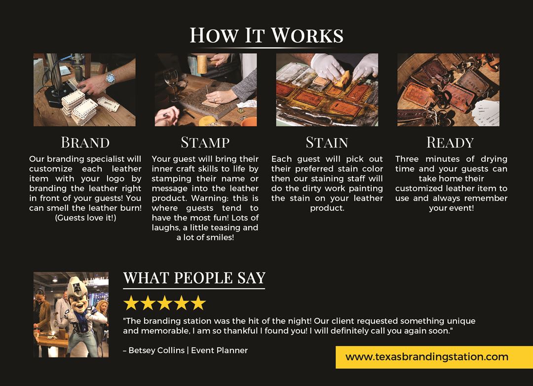 Our six stations include interactive leather stamping, custom branding with your logo and leather staining. Guests will leave the event with a custom product they will continue to use and enjoy! Fantastic for customers gifts, wedding favors and expo swag- memory included of personally making it!