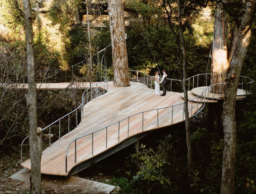 The venue includes a ceremony platform suspended between ancient cypress trees, that can hold you and your bridal party–or for a small wedding, your entire guest list.