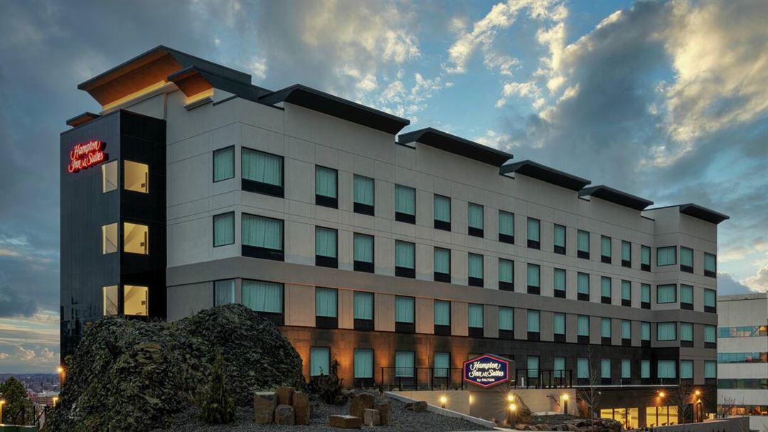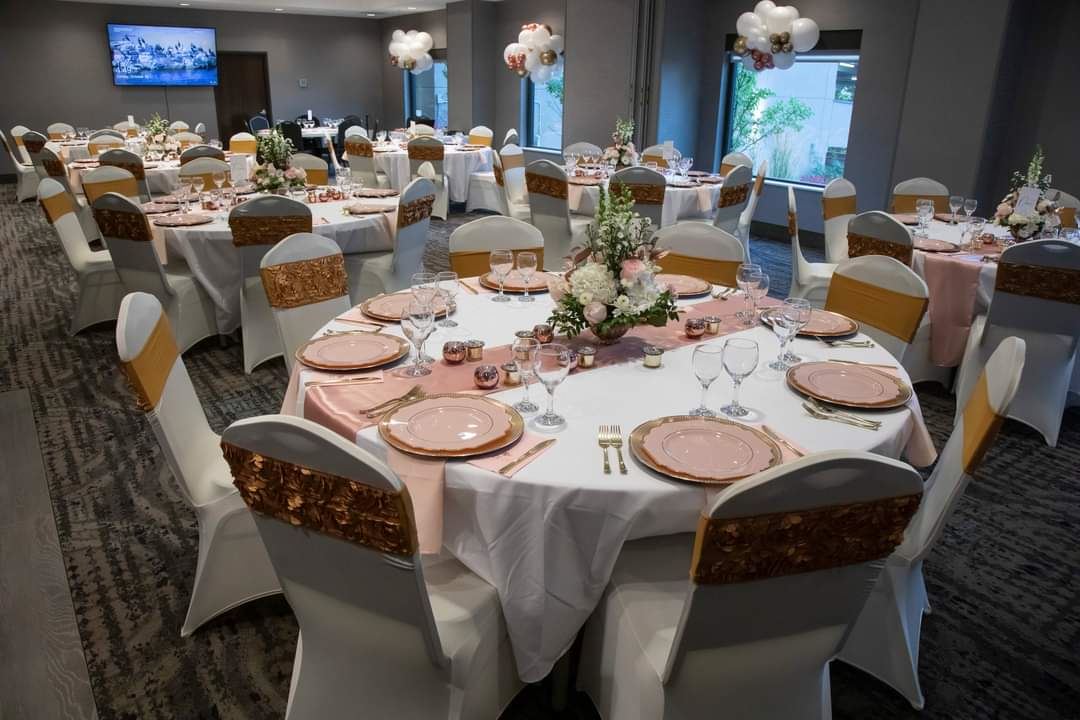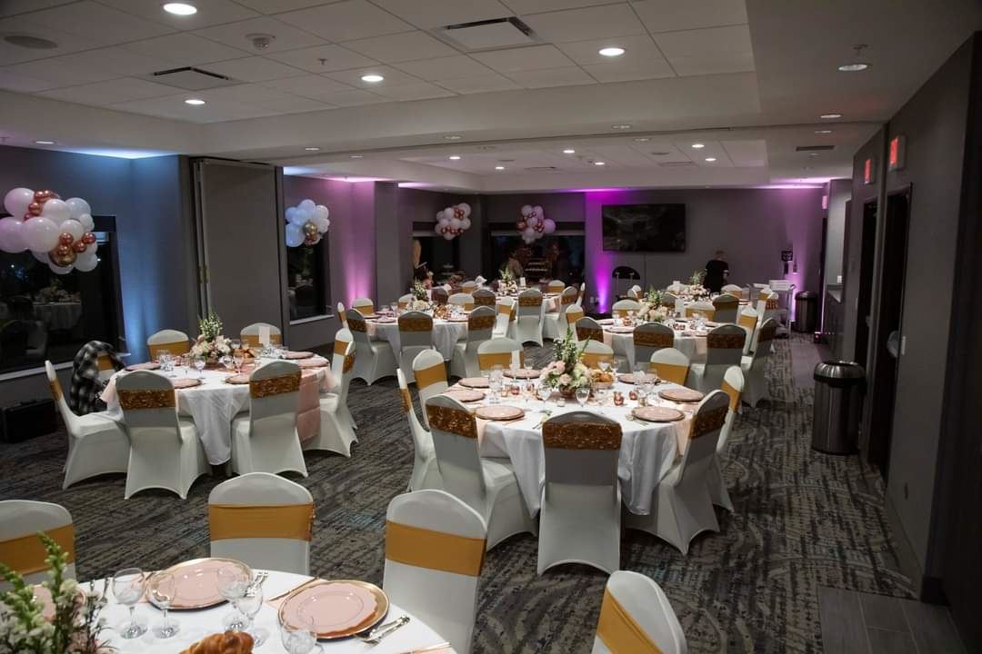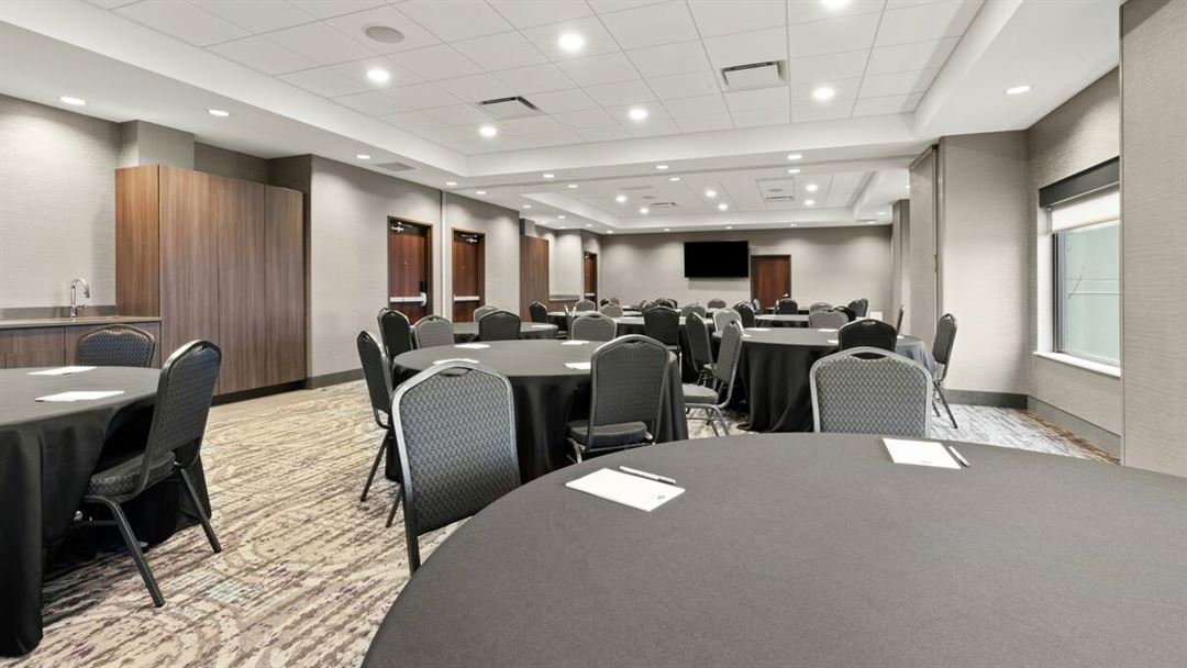 We are a hotel with 109 rooms and have 2 large spaces, each having 1070 sq. Feet. Both large spaces can also be divided in two which would then be 535 sq. feet. Max capacity for 1 large space is 87, but you can always rent both sides and have the full lower level of our hotel to yourselves. Please reach out to see if we may be able to help you with your meeting, event or other. We do not have the ability to cater in house, but you are welcome to bring in outside catering options as well as alcohol with a permit.