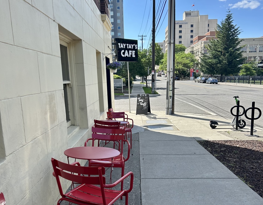 A Cafe near Downtown Spokane with a mico-bakery. We offer coffee drinks, tea, lemonade, house made sodas, and beer/wine. We bake bread, biscuits, cinnamon buns, quiche, and other small bites all from scratch. It is elegant and professional inside the building. We have two dedicated bathrooms available for guests.