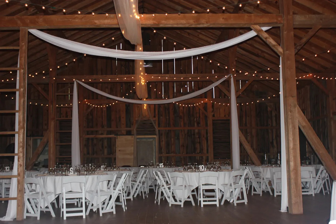 The barn rental includes tables and chairs for 175 indoors, room for 250 outdoors, newly constructed indoor restrooms, commercial kitchen, catering area and a large wrap-around deck and balcony area with breathtaking views.