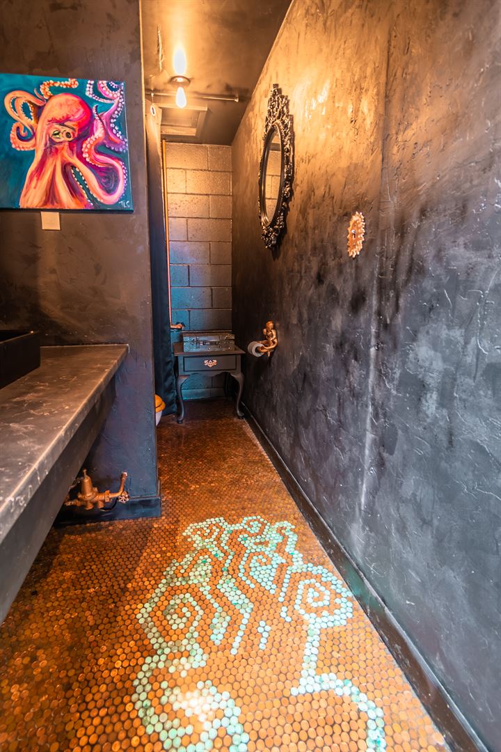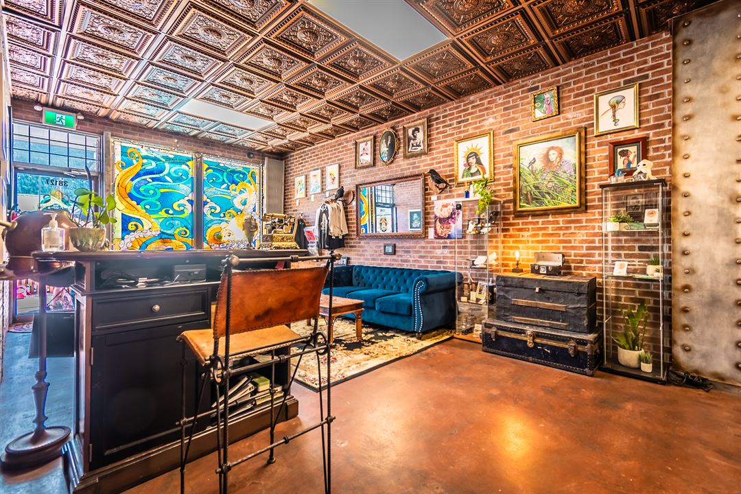 Featuring polished concrete floors and adorned with steampunk-inspired artwork, the space exudes an artistic flair that sets it apart. The warm, rich colors create a cozy yet sophisticated environment, ideal for gatherings ranging from small corporate events to intimate celebrations.