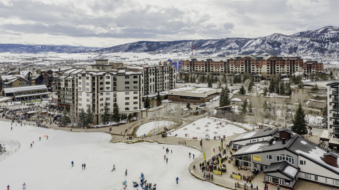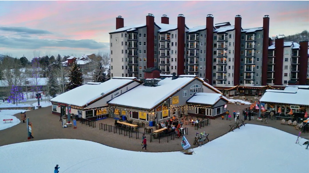 Right outside the patio, a large grassy area provides extra room for mingling, lawn games, or event activation space—all framed by sweeping mountain views and the vibrant atmosphere of Ski Time Square.