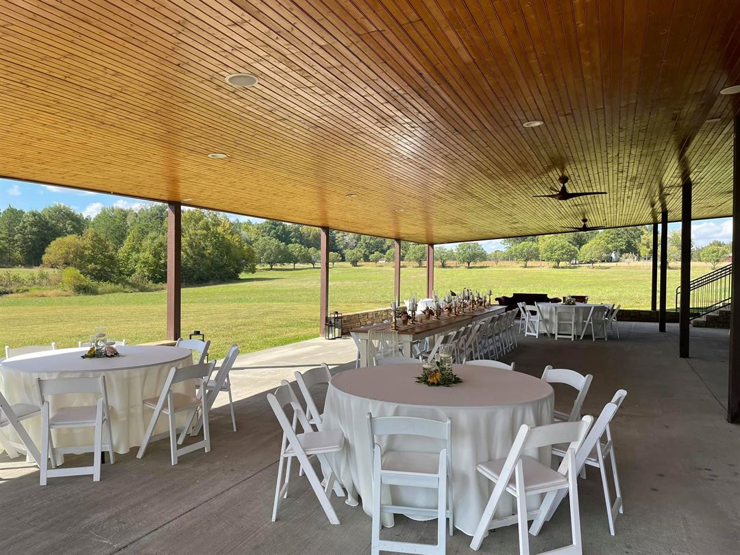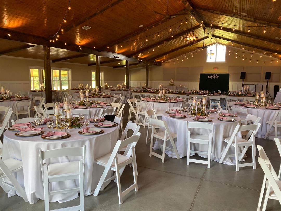 Guests will enjoy a heated and cooled enclosed building with space for over 200 seated guests. Enjoy the view of one of our ponds while you lounge on the covered porch during your special event. Inside awaits indoor bathrooms, catering kitchen and a built-in bar. The facility includes seating and tables for your special day. Contact us to take a tour of our venue!