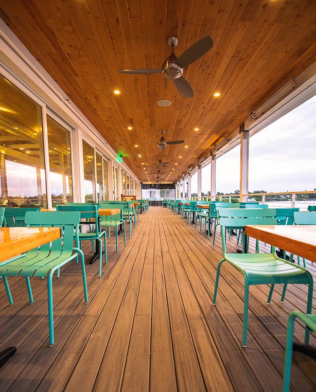 With the luxury of being on the second floor, guests get an unimpeded view of the river as they gaze over the bows of the large boats and out across the water. Come enjoy the trade wind breezes under umbrellas along our outdoor deck and under our open air porch. Enjoy the best of what Florida has to offer.