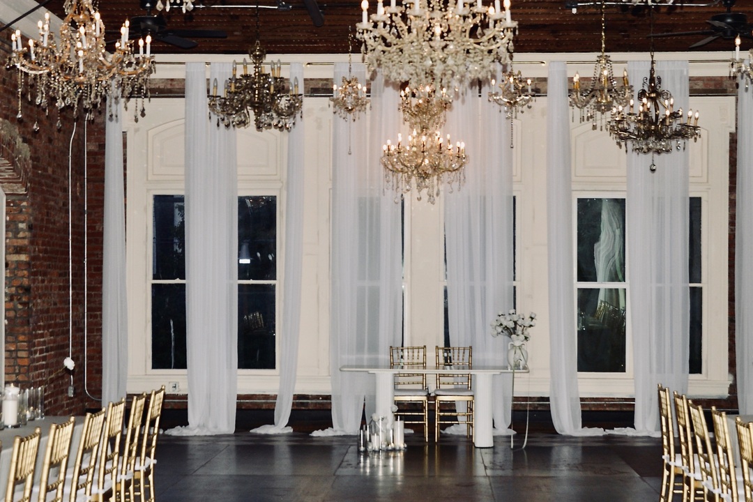 - Rectangle tables, chivari chairs & white chair cushions for up to 80 guests.