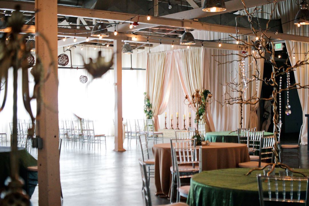 Tin Can Alley Tacoma can welcome receptions for up to 300 friends and family in a chic, artfully-designed setting. This warehouse-style space is illuminated by natural light from large warehouse windows and is open-plan in its layout. The space plays on its industrial undertones, allowing the accents of its past life to peek through its modern decor. Graceful drapery has been hung from its high rafters and as the night goes on fashionable lighting fixtures illuminate the party below. The room can also be transformed to host a sophisticated dinner for 250 invitees. A wide range of furniture comes with the venue, from stylish industrial pieces to farm-style wooden tables and Chiavari chairs. The warehouse’s separate green room can be transformed into a magical bridal suite to be used as a get-ready space. There is ample parking available on-site.