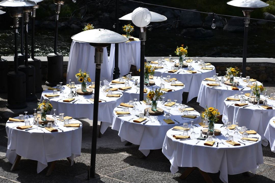 The patio is spacious and picturesque, as it overlooks the scenic Truckee River with a backdrop of Evergreen-covered mountains- great for wedding ceremonies, receptions, rehearsal dinners and more. The outdoor patio is available seasonally during late May, early June, September and early October for a minimum of 75 guests, and can accommodate up to 150 guests seated or 200 standing. The more intimate and formal Fireplace Room is ideal for smaller dinners and receptions for groups of 20 to 40 seated, 50 standing.