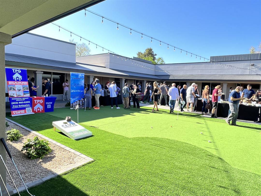 Experience our newly renovated outdoor area featuring lush turf, charming bistro lighting, integrated speakers, misting systems, a putting green, and a variety of fun yard games. Capacity: 600 guests.
