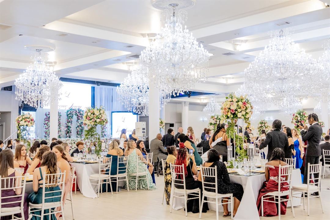 You walk around the imperial staircase into the ballroom, where you are welcomed by thirty chandeliers, each one glowing with any color your heart desires. Each one reflecting off of 72” square tables topped with decorative mirror tops to add a dreamlike aura around the room. The room is just like you envisioned it would be, from the elegant table settings to the centerpieces. The dance floor beckons to you and you start to feel the beat of the state of the art sound system, and finally you let yourself relax. The Sans Souci staff has anticipated your every whim and desire so that you have “no worries” during your special day.