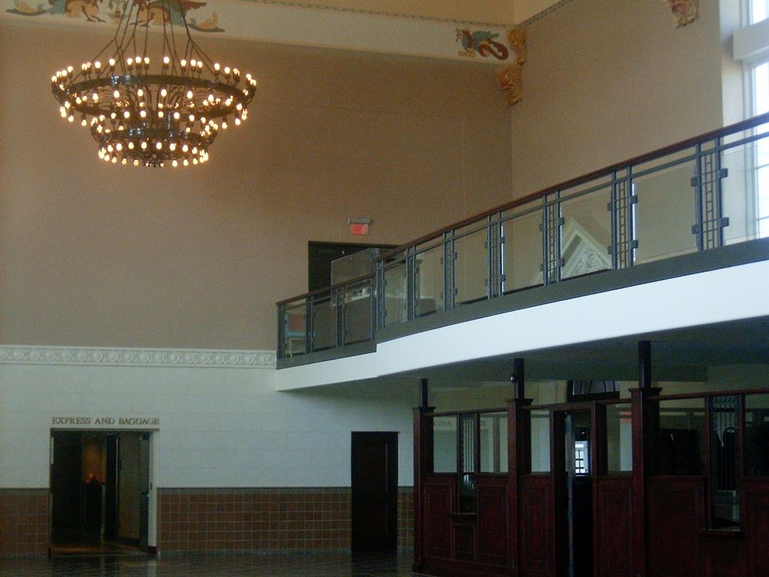 Main Waiting Room and Mezzanine: Enjoy the beauty of the chandeliers, the painted ceilings, the beautiful woodwork and carvings in the lovely Main Waiting Room and Balcony. This space is available for weddings, receptions, corporate events, trade shows, luncheons, reunions, proms, anniversaries, fundraisers, all-day meetings and more.