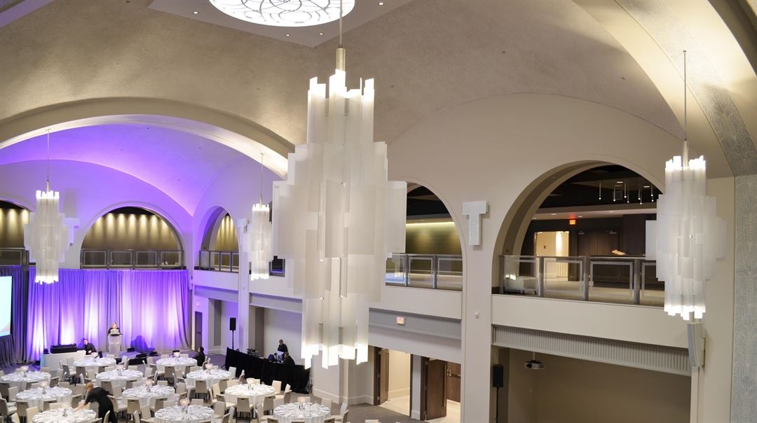 The Court is now a revitalized 8086 square foot gem, featuring improved acoustics, beautiful chandeliers that are a deconstructed take on the original Lalique crystal chandeliers and an opened-up mezzanine spans offering a 360° view. It was named the Best Ballroom in Canada