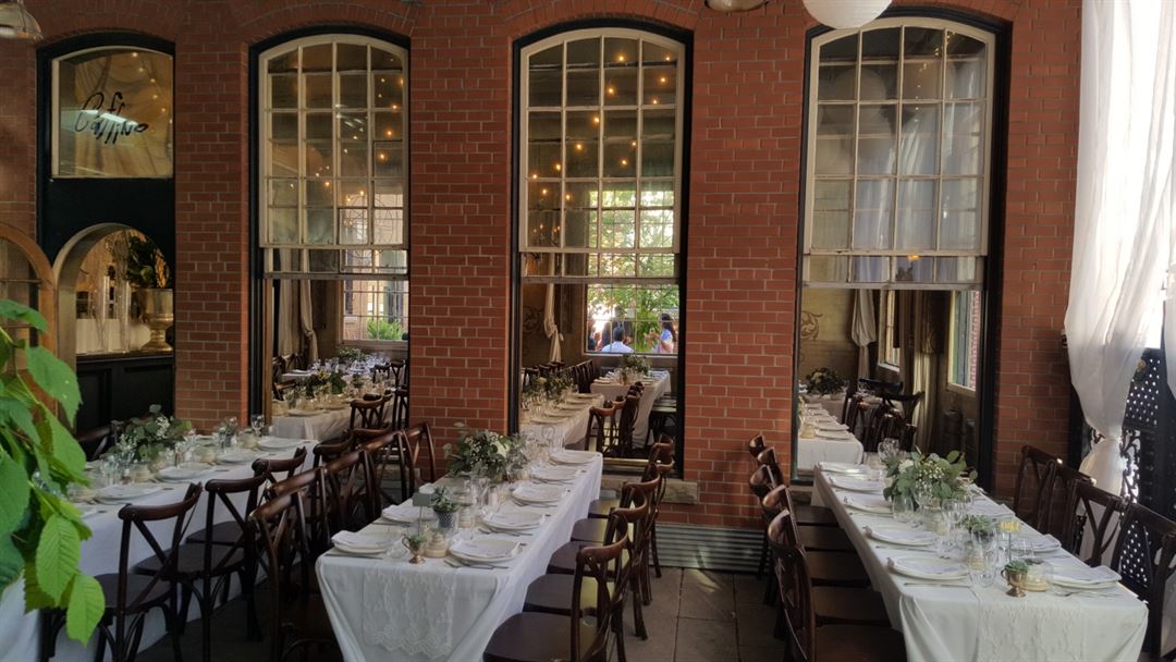 CaFfinO hosts weddings up to 125 people, meshing both in-door and outdoor space. Our outdoor space with the courtyard , tracks and white billowing tent is unique in every way – there’s no other place like it in the City, it makes a perfect backdrop for any ceremony. Our goal is to make all your dreams come true. We offer a wide array of in-house services, including working with your vendors, event planners and you, to ensure that every detail is perfect.