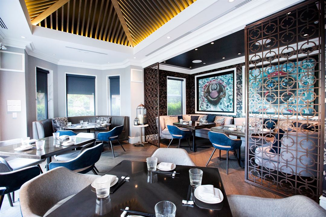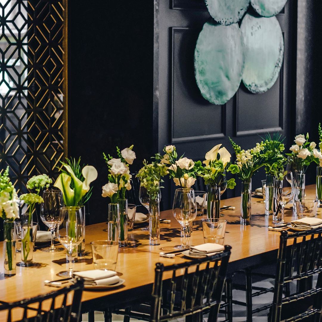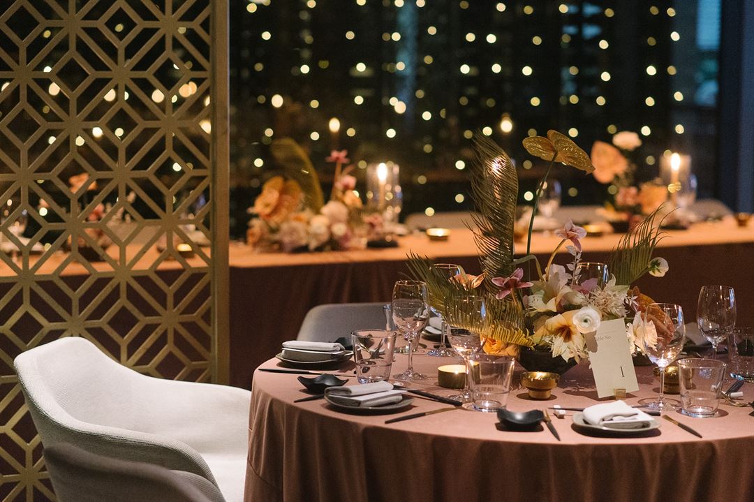 The interior event venue features a modern décor of walnut and oak finishes, Japanese-inspired art, and rich topiary.