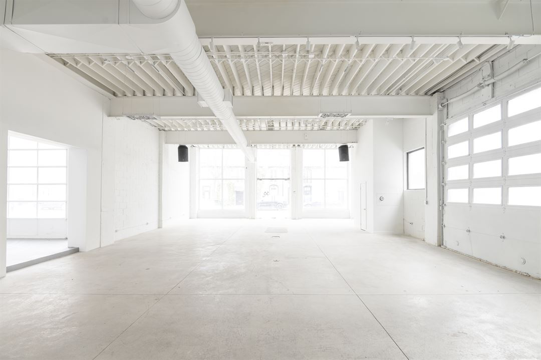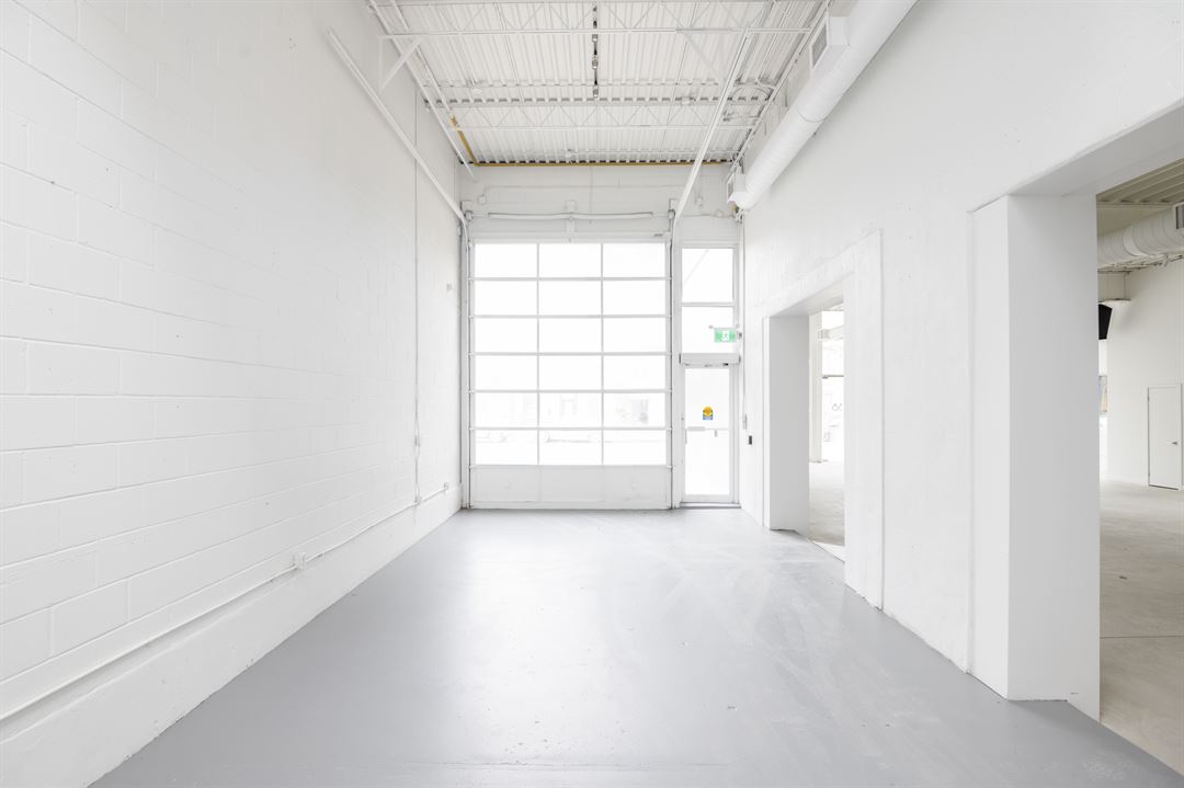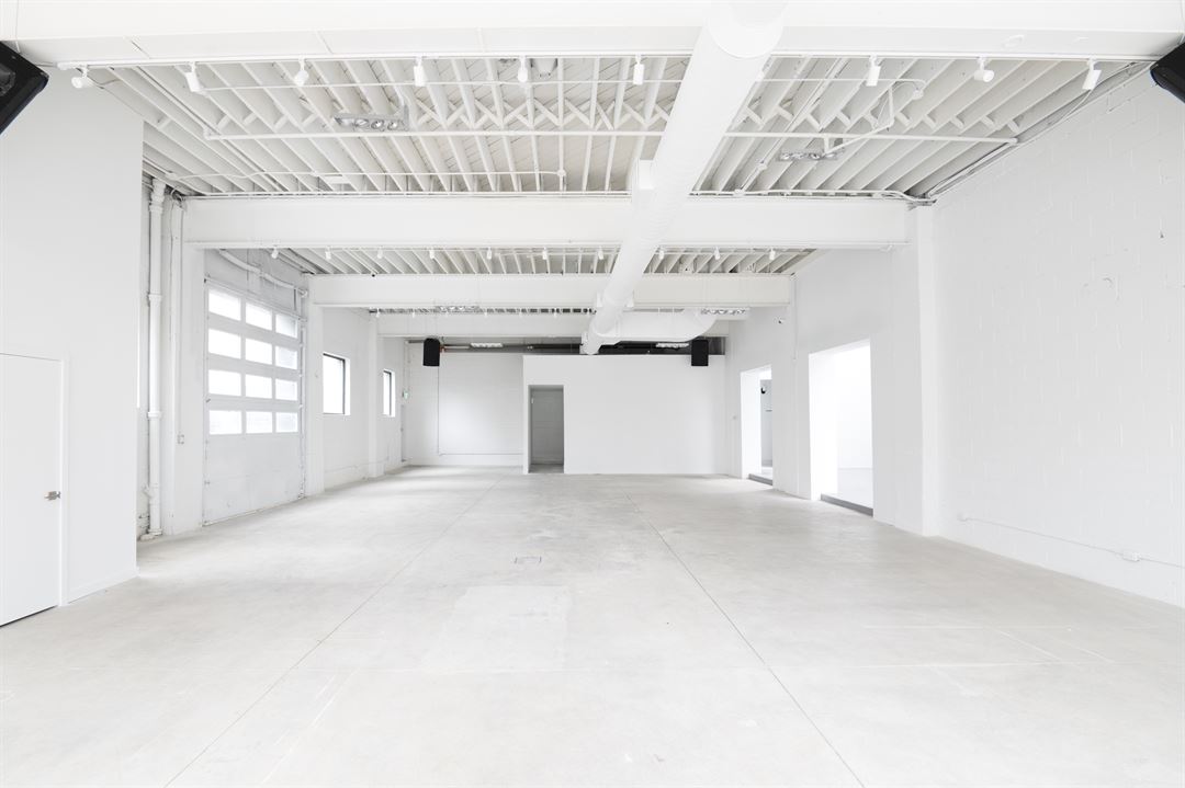 Discover an open concept space with 15 ft ceilings, accents of white brick and two garage doors. Bask in natural light exposure from floor-to-ceiling windows lining the front of the building.
