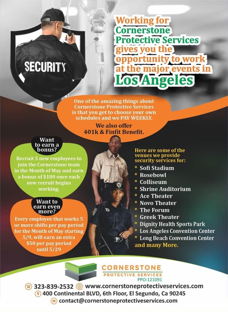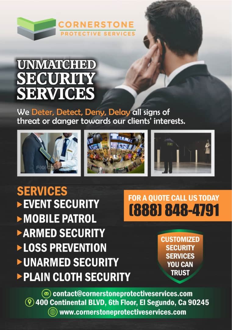 Cornerstone Protective Services offer a wide range of security guard or patrol guard solutions for residential and commercial clients. Whether you need only one security guard in front of your office or a full team of skilled security guards to protect your property, we can provide you with a custom security solution. Safety of your residential and commercial property and whoever lives or works inside always come in first. Moreover, proper security can give your clients peace of mind for doing business with you. At Cornerstone Protective Services, we aim at providing professional security guard services to cater to your all needs. Our security solutions can ensure maximum efficiency and optimum outcomes. Our Services: * Airport Security * Apartments/HOA * Business Parks * Campus Security * Construction Site Security * Education Institutions * Energy / Chemical / Petrochemical / Utilities * Government Facilities * High Rises/Lofts * Hotels/Motels * Manufacturing Facilities * Medical Centers/Hospitals * Marked Vehicle Patrols * Parking Enforcement * Shopping Centers * Special Events Security * Storage Facilities * Cargo and Escort Security Services * Logistics and Transportation * Hiring Security Guard Services Company * Armed and Unarmed Security * Personal Security * and More ..